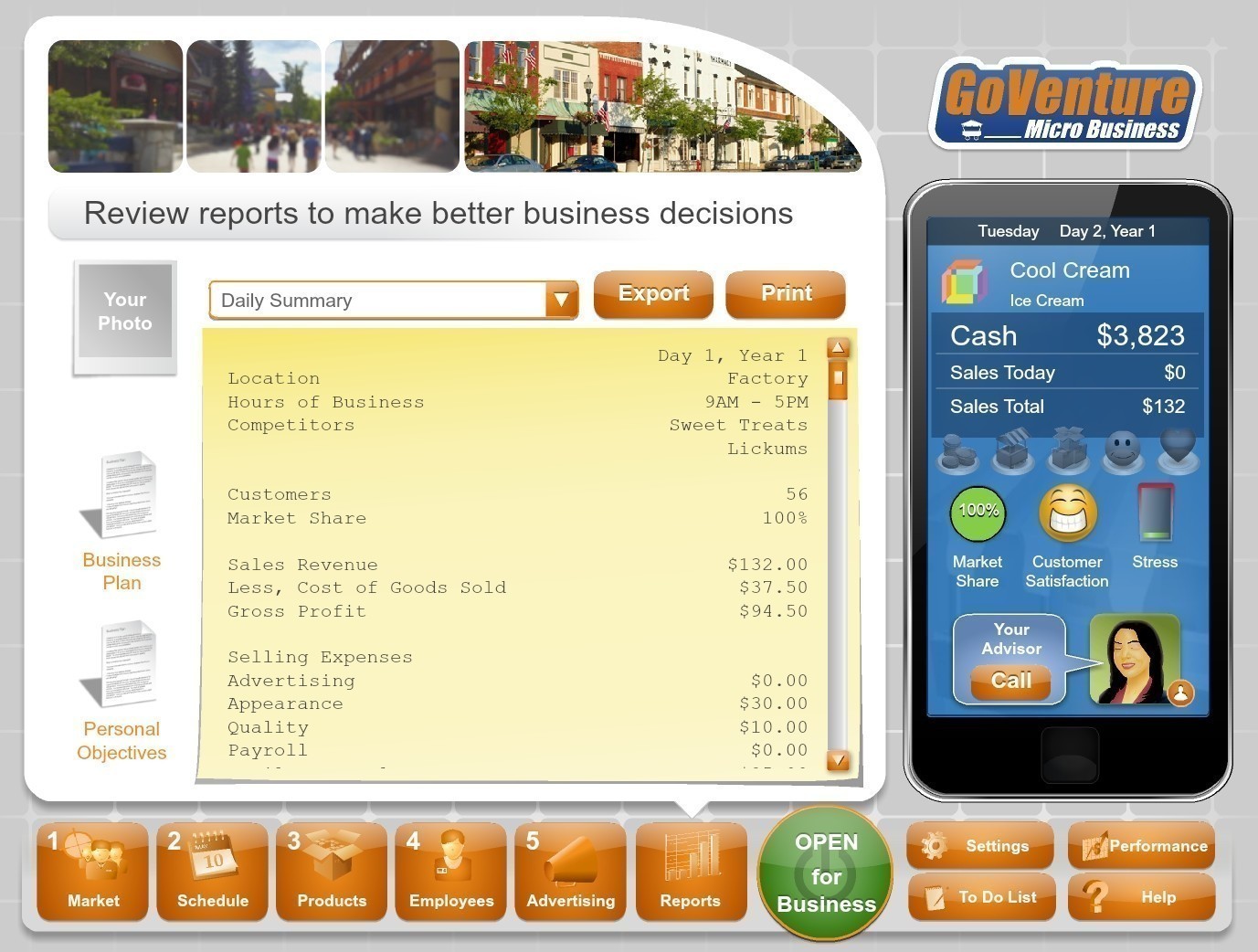 Вы хотите стать следующим бизнес-магнатом, генеральным директором корпорации или социальным предпринимателем? Что ж, все начинается прямо здесь. GoVenture Micro Business ставит вас в роль владельца мобильной тележки для бизнеса, где вы должны решить, какие товары продавать, где и когда их продавать, чтобы максимизировать прибыль и сделать своих клиентов счастливыми. Узнайте все, что вам нужно знать об основах открытия и ведения бизнеса. Это ваш первый шаг к тому, чтобы стать собственным боссом.