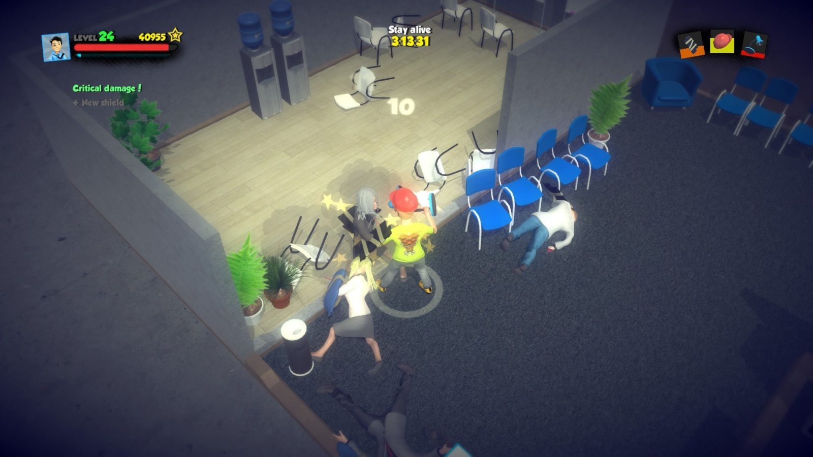 Добро пожаловать в Офисную битву! Многие работники потеряют работу, потому что очень скоро в вашем офисе произойдет увольнение. Вот почему “Большой Б” решил организовать конкурс, и победители получают право сохранить свою работу. Но не думайте, что это будет легко. “Большой Б” будет время от времени проверять самого достойного офисного чемпиона.