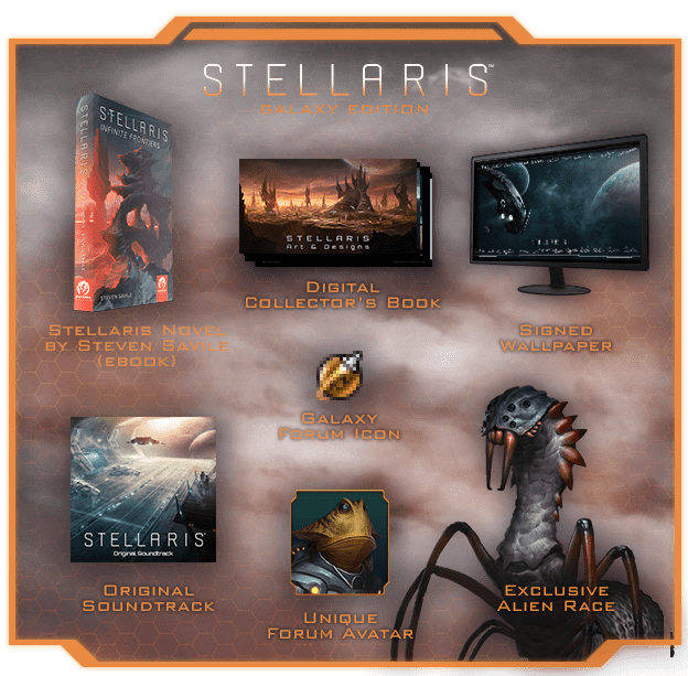 Присоединяйтесь к творческой команде Stellaris, чтобы узнать, как эстетика игры была разработана и реализована для самой визуально уникальной игры Paradox на сегодняшний день. Эта эксклюзивная 71-страничная книга включает в себя коллекцию игрового искусства, от концепт-арта до полных иллюстраций и 3D-рендеринга, а также информацию о мыслях и исследованиях, лежащих в основе этих проектов, а также о проблемах, с которыми команда столкнулась на протяжении всего пути. способ, и способы, которыми они, наконец, воплотили эти визуальные эффекты в жизнь.